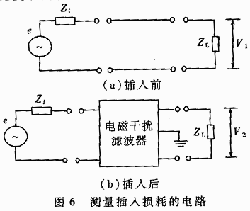 假定負載阻抗在插入前后始終保持不變,則P1=V12/Z,P2=V2 2/Z。式中V1是噪聲源直接加到負載上的電壓,V2是在噪聲源與負載之間插入電磁干擾濾波器后負載上的噪聲電壓,且V2< AdB=20lg(V1/V2)??? (2) 插入損耗用分貝(dB)表示,分貝值愈大, 計算EMI濾波器對地漏電流的公式為: ILD=2πfCVc??? (3) 式中,ILD為漏電流,f是電網頻率。以圖1為例,f=50Hz,C=C3+C4=4400pF,Vc是C3、C4上的壓降,亦即輸出端的對地電壓,可取Vc≈220V/2=110V。由(3)式不難算出,此時漏電流ILD=0.15mA。C3和C4若選4700pF,則C=4700pF×2=9400pF,ILD=0.32mA。顯然,漏電流與C成正比。對漏電流的要求是愈小愈好,這樣安全性高,一般應為幾百微安至幾毫安。在電子醫(yī)療設備中對漏電流的要求更為嚴格。 需要指出,額定電流還與環(huán)境溫度TA有關。例如國外有的生產廠家給出下述經驗公式: 3.2 測量插入損耗的方法 測量插入損耗的電路如圖6所示。e是噪聲信號發(fā)生器,Zi是信號源的內部阻抗,ZL是負哉阻抗,一般取50Ω。噪聲頻率范圍可選10kHz~30MHz。首先要在不同頻率下分別測出插入前后負載上的噪聲壓降V1、V2,再代入(2)式中計算出每個頻率點的AdB值,最后繪出插入損耗曲線。需要指出,上述測試方法比較煩瑣,每次都要拆裝EMI濾波器。為此可用電子開關對兩種測試電路進行快速切換。