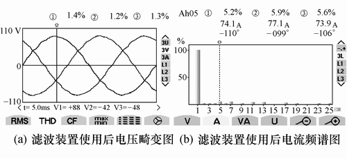 電流達(dá)到45A,從波形上明顯看到畸變嚴(yán)重??傠娏鳛?46A,畸變率為22.2%,總的諧波電流可以計(jì)算出為746×22.2%=165.61A。 治理方案:在變壓器副邊側(cè)并聯(lián)接入200A有源電力濾波器對(duì)其