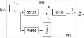 ??? 2)用UPS作為應(yīng)急電源EPS從原理結(jié)構(gòu)上和UPS大同小異。在線式UPS不論市電是否正常,它都一直由逆變器供電,即按照“市電輸入→整流→逆變→輸出”的順序進行,只有在逆變器故障或過載時才改由旁路輸出,如圖5所示。而EPS,當(dāng)市電正常時,市電通過開關(guān)S輸出給負(fù)載,同時充電器對電池充電。當(dāng)控制系統(tǒng)檢測到市電停電時,逆變器工作,使開關(guān)S切換至逆變輸出狀態(tài),向負(fù)載提供電能,如圖6所示。