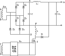 ??? 二次為橋式整流電路如圖4所示。圖中D1,D2,D3,D4為主整流管;D11及D12為毛刺吸收電路專用二極管。Lo與Co為主整流電路中的電感和電容;C為毛刺能量儲(chǔ)存電容。L,S,D組成毛刺能量轉(zhuǎn)換釋放電路。主變壓器中繞組CD和脈沖轉(zhuǎn)換電路一起形成S的開關(guān)控制脈沖ugs,與繞組AB形成固定的相位關(guān)系。繞組AB的電壓uAB波形與S上的驅(qū)動(dòng)脈沖波形示于圖5。