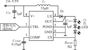 圖2? MAX1848基本應(yīng)用電路 ??? COMP端(腳1)為誤差放大器的補(bǔ)償端,外接一個(gè)電容器到地,這電容的容量對軟啟動(dòng)有作用,每0.01μF啟動(dòng)時(shí)間大約為0.833ms。 ??? CTRL端(腳2)為LED亮度調(diào)節(jié)端,也可控制LED的亮、滅(雙模式制)。當(dāng)此端加250mV到5.5V或(V+加2V)時(shí),將隨電壓變化起調(diào)節(jié)LED亮度作用;當(dāng)此端加100mV以下電壓或接地時(shí),器件被關(guān)閉,LED滅。 2.1? LED電流的設(shè)定 ??? 流過LED的電流ILED與CTRL端的電壓、連接在CS端的RSENSE有關(guān),其關(guān)系式為 ??? ILED=VCTRL/(13.33×RSENSE) 式中:VCTRL為在CTRL端的電壓(250mV到5.5V)或V+加2V。則在VCTRL最大時(shí),LED電流最大,LED最亮。 ??? 在實(shí)際計(jì)算時(shí),先設(shè)定最大的VCTRL值,根據(jù)要求的ILED來確定RSENSE。一般LED的最大電流ILED(max)為15~20mA,則可用下式求出 ??? RSENSE= 例如,ILED(max)=20mA,VCTRL(max)=2V,則RSENSE=7.5Ω。 ??? 為減小在RSENSE的損耗,可減小RSENSE。則也可以先設(shè)定RSENSE,及根據(jù)最大的ILED(max)來確定所需的VCTRL(max)值。 ??? 例如,ILED(max)=20mA,RSENSE=5Ω,則按上式可求得VCTRL(max)=1.33V。 ??? VCTRL電壓可來自數(shù)字/模擬轉(zhuǎn)換器(DAC) 2.2? 元器件的選擇 ??? 1)CIN及COUT的選擇 ??? CIN與COUT的選擇并不嚴(yán)格,其典型值是CIN=3.3μF,COUT=1μF。適當(dāng)增加CIN及COUT的容量可減小紋波電壓,但會(huì)增加尺寸及成本。CIN、COUT可選擇貼片式多層陶瓷電容器(X5R介質(zhì)材料),它們有極低的串聯(lián)等效電阻(ESR)及很好的溫度穩(wěn)定性。 ??? 2)CCOMP的選擇 ??? CCOMP的容量與軟啟動(dòng)時(shí)間(tss)有關(guān),它們的關(guān)系為 ??? tss(max)=CCOMP× ??? 一般可按表1的情況選取。 ??? 3)電感器L1的選擇 ??? 電感器L1的大小與ILED有關(guān),可按表1的ILED大小來選取。 ??? 4)D1的選擇 ??? 由于D1工作在1.2MHz的高頻,需要采用恢復(fù)時(shí)間小及正向壓降小的肖特基二極管。其工作電流ID(rms)與電感器的峰值電流IPEAK及LED的電流ILED有關(guān),其關(guān)系為 ??? ID(rms)= 可以按表1中的ILED及電感器的IPEAK來求出ID(rms),并且要求D1的擊穿電壓大于VOUT。 表1? 元器件選擇