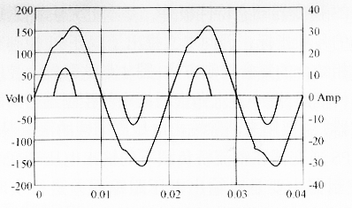 (b)復合控制 圖5整流橋負載下的電壓電流仿真波形 ??? 圖6為整流器負載下的電壓電流實驗波形比較,用LEM公司的鉗表測得,圖6(a)中的電壓THD=8.2%,圖6(b)中的電壓THD=4.2%,采用復合控制的UPS逆變器的輸出波形畸變有明顯的減小。