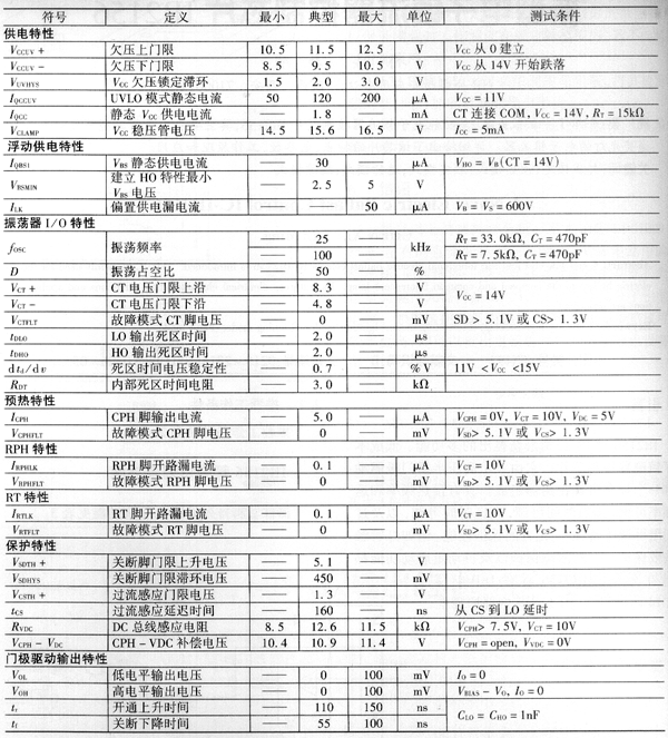 圖1? IR2156內(nèi)部原理框圖 2? 主要電氣特性 2.1? 主要電氣特性 ??? 主要電氣特性見表1。除非另有說明,一般情況下: ??? VCC=VBS=VBIAS=14V±0.25V,VVDC=OPEN,RT=39.0kΩ,RPH=100.0kΩ,CT=470pF,VCPH=0.0V,VCS=0.0V,VSD=0.0V,CLO,HO=1000pF,Ta=25℃。 表1? 主要電氣參數(shù)