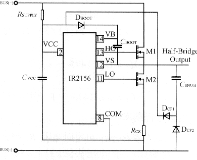 圖2管腳排列 4? 功能簡介 4.1? 欠壓關(guān)斷(UVLO)模式 ??? 欠壓關(guān)斷模式是當(dāng)供電電壓VCC低于IC的開啟門限電壓時,IC不工作。IR2156的欠壓關(guān)斷模式要求供電電流最小保持在200μA以上,保證IC正常工作并驅(qū)動高低端輸出。圖3為典型的從直流母線饋電和從鎮(zhèn)流器輸出級充電泵共同為IR2156供電的例子。通過供電電阻(RSUPPLY)的電流一部分作為啟動電流流入IC,其余給啟動電容(CVCC)充電。電阻應(yīng)能供應(yīng)兩倍的最大啟動電流,以保證鎮(zhèn)流器在低電壓輸入下啟動。一旦VCC腳電容電壓到達(dá)啟動門限,且SD腳電壓低于4.5V,則IC開始工作,HO,LO振蕩。由于IC工作電流增大,電容開始放電見圖4。