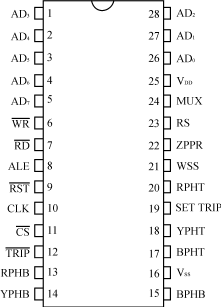 圖2SA4828管腳圖 圖3為SA4828的內(nèi)部結(jié)構(gòu)框圖,從圖中可以看到SA4828主要由三部分構(gòu)成: (1)接收并存儲(chǔ)微處理器命令(控制字)的部分,它主要由總線控制、總線譯碼、暫存器R0、R1…R5,虛擬寄存器R14、R15及32位初始化寄存器和48位控制寄存器構(gòu)成; (2)從波形ROMS讀取調(diào)制波形的部分,它由地址發(fā)生器和波形解壓縮緩沖器構(gòu)成; (3)三相輸出控制電路及輸出脈沖鎖存電路,每相輸出控制電路又由脈沖刪除電路和脈沖延遲電路組成。 SA4828芯片具有并行的接口與微處理器進(jìn)行通信。該接口和幾乎所有工業(yè)標(biāo)準(zhǔn)的微處理器諸如8051、8096、6805、68000和TMS320等兼容而不需要考慮總線的寬度及增加額外的邏輯電路。大多數(shù)的數(shù)據(jù)總線結(jié)構(gòu)可分為復(fù)用地址/數(shù)據(jù)總線和獨(dú)立的地址/數(shù)據(jù)總線,而大部分的微處理器不是WR/RD結(jié)構(gòu)就是R/W結(jié)構(gòu);而該芯片設(shè)計(jì)成可以與上述四種組合中的任一種配合使用。通過一個(gè)配置引腳(MUX)和一個(gè)寄存器選擇引腳(RS)的狀態(tài)來區(qū)別所有的總線格式。 更重要的是,在系統(tǒng)異常情況(過流或過壓)下,一個(gè)緊急關(guān)斷輸入(SETTRIP)能不受微處理器的控制而迅速關(guān)斷所有的PWM輸出,這很好地解決了變頻器的快速保護(hù),避免了因CPU中斷服務(wù)指令周期所造成的延誤。 3.3SA4828芯片的控制功能 對(duì)SA4828芯片的控制是通過微處理器接口將數(shù)據(jù)送入內(nèi)部的兩個(gè)寄存器來實(shí)現(xiàn)的。它們是初始化寄存器和控制寄存器。