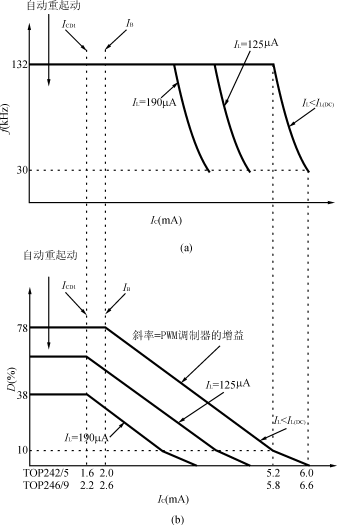 圖2TOPSwitch?GX的內(nèi)部框圖 3TOPSwitch?GX的工作原理 采用Y封裝的TOPSwitch?GX系列產(chǎn)品,其內(nèi)部框圖如圖2所示。電路主要由18部分組成: (1)控制電壓源; (2)帶隙基準(zhǔn)電壓源; (3)頻率抖動振蕩器; (4)并聯(lián)調(diào)整器/誤差放大器; (5)脈寬調(diào)制器(含PWM比較器和觸發(fā)器); (6)過流保護(hù)電路; (7)門驅(qū)動級和輸出級; (8)具有滯后特性的過熱保護(hù)電路; (9)關(guān)斷/自動重起動電路; (11)軟起動電路; (12)欠壓比較器; (13)電流極限比較器; (14)線路比較器; (15)線路檢測端和極限電流設(shè)定端的內(nèi)部電路; (16)輕載時自動降低開關(guān)頻率的電路; (17)停止邏輯; (18)開啟電壓為1V的電壓比較器。 它與TOPSwitch?FX的主要區(qū)別為:新增加了第(16)、(17)、(18)項單元電路;給電流極限調(diào)節(jié)器也增加了軟起動輸出端;將頻率抖動振蕩器產(chǎn)生的開關(guān)頻率提升到132kHz(全頻模式)或66kHz(半頻模式);給頻率抖動振蕩器增加了一個“停止邏輯”(STOPLOGIC)電路,使之工作更為可靠。TOPSwitch?GX的工作原理仍然是利用反饋電流IC來調(diào)節(jié)占空比D,達(dá)到穩(wěn)壓目的。舉例說明,當(dāng)輸出電壓VO降低時,經(jīng)過光耦反饋電路使得IC減小,占空比則增大,輸出電壓隨之升高,最終使VO維持不變。 TOPSwitch?GX與TOPSwitch?FX的性能比較,詳見表2。下面重點闡述TOPSwitch?GX新增功能電路的原理。 3.1輕載時自動降低開關(guān)頻率的電路 對TOPSwitch?GX而言,開關(guān)頻率及占空比能隨輸出端負(fù)載的降低而自動減小。其減小量與控制端流入的電流成反比。當(dāng)控制端電流逐漸增大時,占空比能線性地減少到10%,但是當(dāng)負(fù)載很輕時,占空比可低于10%。與此同時,開關(guān)頻率也減少到最小值,以提高開關(guān)電源在輕載下的效率。當(dāng)開關(guān)頻率的正常值(即典型值)為132kHz時,頻率最小值為30kHz,在半頻模式下開關(guān)頻率正常值為132kHz/2=66kHz,此時頻率最小值就降至15kHz。該特性能保證開關(guān)電源在輕載時,仍保持良好的調(diào)節(jié)功能,并且降低了電源的開關(guān)損耗。開關(guān)頻率f和占空比D與控制端電流IC的關(guān)系如圖3所示。