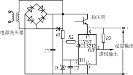 圖19欠壓保護(hù) 對于電源中對高電壓瞬態(tài)特性敏感的負(fù)載,這個(gè)電路有保護(hù)作用。如果輸入電壓高于電阻R1、R2設(shè)定的門限電壓值,ICL8211在負(fù)載的瞬態(tài)期間可關(guān)斷V1,從而保護(hù)負(fù)載,如需要可通過設(shè)定R3來選擇適當(dāng)?shù)幕夭铍妷骸?/P> 過壓保護(hù)電路的典型應(yīng)用形式是晶閘管撬桿電路,在過壓情況下,它可以短路電源輸出。圖17所示電路,當(dāng)達(dá)到由R1、R2設(shè)定的門限電壓時(shí),電路觸發(fā)晶閘管。極低的ICL8212靜態(tài)電流意味著可忽略在檢測期間R4上的壓降,所以精度很高,并且可靠觸發(fā)晶閘管。由于只要達(dá)到門限電壓值時(shí),電路將提供負(fù)反饋,電阻R4上的電壓將上升,這樣通過第2引腳可提供回差電壓,這點(diǎn)可通過第2引腳的足夠正反饋來克服。電阻R3用以限制ICL8212的輸出電流到一個(gè)安全值,即20mA。為使電路正常工作,晶閘管的觸發(fā)電流不大于10mA,可采用圖18所示電路得到更大的晶閘管觸發(fā)電流。 在這種情況下,ICL8211使V1的基極電位保持低值,直至這個(gè)晶閘管被觸發(fā)。電路中通過R3的電流最大值為4mA,過大會(huì)超過ICL8211的輸出能力。這個(gè)電路中晶閘管的觸發(fā)電流范圍為50mA~100mA。 注意在以上兩個(gè)電路中要使撬桿保護(hù)電路工作電壓低至3V,只需單一電源供電即可。所以這種電路很適用于為邏輯電路供電,實(shí)際上為了使電路安全可靠工作,不希望使用輔助電源。 如果供電電壓低于由R1、R2決定的設(shè)定值時(shí),V1關(guān)斷,完全切斷負(fù)載,致使電路不工作。需注意的是,當(dāng)斷開負(fù)載瞬間會(huì)使輸出電壓上升并可能伴有振蕩現(xiàn)象。所以,利用電阻R3提供一個(gè)回差電壓,這個(gè)回差電壓應(yīng)大于滿載時(shí)穩(wěn)壓電源壓降。 圖16和圖19所示電路可接成如圖20所示的電路:電源電壓在一個(gè)指定范圍內(nèi)只接有一個(gè)負(fù)載。這種電路中,IC1用作過壓檢測而IC2用于欠壓檢測。同樣由電阻R3、R5可設(shè)定電路回差范圍。 在許多電路系統(tǒng)中,特別是采用微處理器的電路系統(tǒng)中,為保護(hù)系統(tǒng)正常工作,常需在整個(gè)系統(tǒng)供電發(fā)生故障前能使系統(tǒng)發(fā)出控制信號,從而使整個(gè)系統(tǒng)能先于電源故障關(guān)斷。在這種情況上僅用欠壓保護(hù)顯得不足。 利用圖21所示電路可以在穩(wěn)壓電源的輸入端檢測電源的早期故障,電路中電容C1的容量應(yīng)足夠大,以確保系統(tǒng)在供電發(fā)生故障的情況下有足夠的時(shí)間對系統(tǒng)電路提供保護(hù)。電源的典型故障波形如圖22所示。