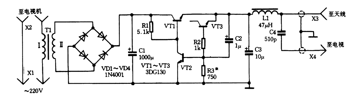 這里推薦的天線放大器電源與眾不同,其特點(diǎn)是不采用傳統(tǒng)的降壓變壓器,也無需開關(guān),可與電視機(jī)同時(shí)接通工作。 電路如圖所示。電流變換器T1的初級(jí)繞組直接串接在電視機(jī)電源回路中,在其上約有2~ 3V的壓降