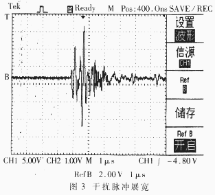 由實(shí)測(cè)波形可看到電磁干擾為重復(fù)頻率50Hz的強(qiáng)脈沖電磁干擾,其脈沖展寬后波形如圖3所示。