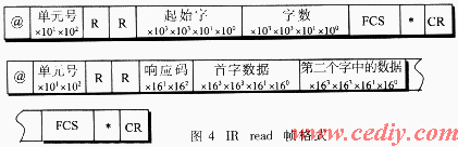 用上位機(jī)對(duì)可編程控制器進(jìn)行監(jiān)視和控制,在兩者之間建立數(shù)據(jù)傳輸通道,首先要規(guī)定兩者之間數(shù)據(jù)傳輸?shù)母袷?,并?duì)命令格式形成和響應(yīng)格式的解碼進(jìn)行編程。Omron把所有指令幀和應(yīng)答幀的定義稱做Host Link協(xié)議(Host Link Protocol)。而在Host Link協(xié)議中識(shí)別碼指令有39種之多,可以完成對(duì)可編程控制器各個(gè)存儲(chǔ)區(qū)(IR、SR、DM、AR、EM、LR、HR)的讀寫、對(duì)可編程控制器進(jìn)行初始化、置位和I/O表生成等各種任務(wù)。圖4的第一行是一個(gè)上位計(jì)算機(jī)發(fā)出的讀PLC內(nèi)部繼電器區(qū)(IR區(qū))的命令幀,第二行是PLC對(duì)這個(gè)命令的響應(yīng)幀。