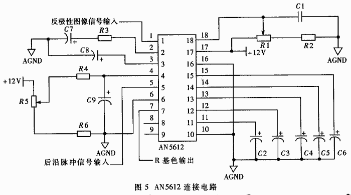 反極性圖像信號(hào)加到解集成電路AN5612的1腳,在其內(nèi)部進(jìn)行視頻放大,增益由18腳外接對(duì)比度電位器R1控制。頻率特性由R3、C7組成的網(wǎng)絡(luò)進(jìn)行高頻補(bǔ)償。4腳的外接膏藥度電位器R5調(diào)節(jié)黑電平的高低。視頻信號(hào)在加入AN5612之前由于通過耦合電容失去了直流成分,因此,視頻信號(hào)的消隱電平而改變。為了克服這個(gè)缺點(diǎn),可采用直流耦合放大,但由于一般的直流耦合放大容易產(chǎn)生溫漂,致使黑電平難以穩(wěn)定。常用的辦法是采用鉗位電路,將復(fù)合同步脈沖延遲至行消隱信號(hào)后肩,從而把亮度信號(hào)的消隱電平鉗位于給定的直流電平上。LM1881的5腳輸出的信號(hào)即為所需要的鉗位脈沖。這部分電路見圖5.AN5612的7腳輸出R基色信號(hào),作為比較器LM361的一路輸入。