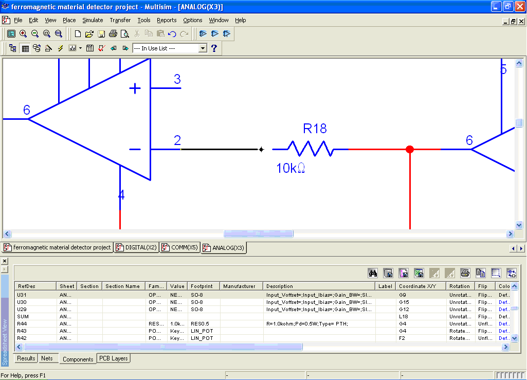 With parts placed and connections created, even a simple design begins to evolve into a schematic of size and complexity. Devices and wires span a sheet, making the search for specific elements somewhat difficult. This is an issue since the nature of the development process is to be in a state of constant change, with elements being moved and edited while a design is improved. The ability to easily manage and access these elements across a vast schematic is extraordinarily important. For a design of any scope, the Multisim spreadsheet view (Figure 4) is a detailed tabular listing of all nets and components that can be sorted by reference designator, schematic sheet and other properties. The engineer benefits from an organized, single interface in which to view and edit the properties of the listed design elements. This spreadsheet view gathers the functionality that can normally only be accessed by selecting the part itself on the schematic. This offers immediate and comprehensive access to all elements of a circuit. From this spreadsheet view, a footprint can be changed, a part replaced and a net renamed, eliminating the trying task of searching across multiple pages and numerous blocks to accomplish the same result.
