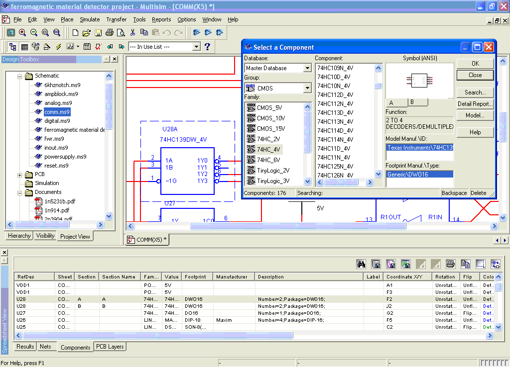 When using hierarchical blocks for modular design, the next requirement of the capture tool is to centrally manage all stages of the design, from schematics to datasheets, to proposal and design documents. This entails a project-based approach, and is advantageous to both to small simple designs and more complex and broad-reaching circuits. In the Multisim environment a project can be defined. Through this project all schematics, layout files and documents can be linked together. This organization creates a single project that binds the separate parts of a design into one entity, simplifying the management of all parts of the design process, particularly in team development. When?collaboration extends among cubicles or continents, Multisim provides an organized way to effectively bring a design together.