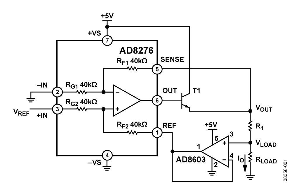 Figure 1: Current Source Using the AD8276 Difference Amplifier and the AD8603 Op Amp (Simplified Schematic)