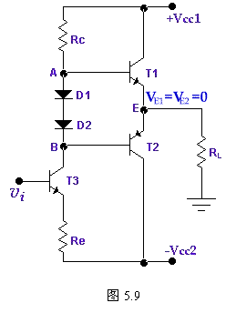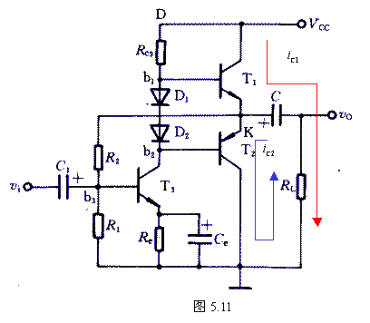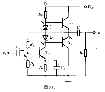 上述情況是理想的。實(shí)際上,圖5.10的輸出電壓幅值達(dá)不到Vom= Vom/2,這是因?yàn)楫?dāng)vi為負(fù)半周時(shí),T1導(dǎo)電,因而iB1增加,由于RC3上的壓降和VBE1的存在,當(dāng)K點(diǎn)電位向+VCC接近時(shí),T1的基流將受限制而不能增加很多,因而也就限制了T1輸向負(fù)載的電流,使RL兩端得不到足夠的電壓變化量,致使Vom明顯小于VCC/2。