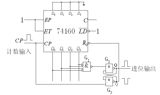 圖5.3.37b 用置數(shù)法將74160接成六進制計數(shù)器(置入1001)