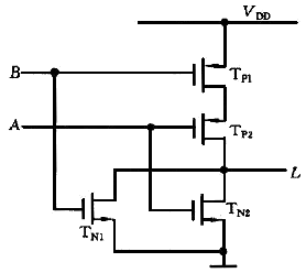 當(dāng)A和B均為低電平時(shí),則兩個(gè)MOSFET MPA和MPB均導(dǎo)通,T1導(dǎo)通而MNA和MNB均截止,輸出L為高電平。與此同時(shí),M1通過MPA和MpB被VDD所激勵(lì),從而為T2的基區(qū)存儲電荷提供一條釋放通路。