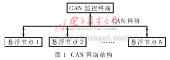 對(duì)于多點(diǎn)懸浮控制來說,為了降低風(fēng)險(xiǎn)和提高控制靈活性,1個(gè)懸浮點(diǎn)一般由1個(gè)單獨(dú)的控制器控制,各個(gè)懸浮點(diǎn)和監(jiān)控節(jié)點(diǎn)的關(guān)系如圖1所示。CAN監(jiān)控終端也是CAN網(wǎng)絡(luò)中的一個(gè)普通節(jié)點(diǎn),通過雙絞線連入整個(gè)網(wǎng)絡(luò)。