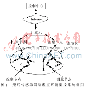 ,從而實時對現(xiàn)場設備進行監(jiān)控,并通過WEB SEVER實現(xiàn)遠程監(jiān)控。監(jiān)控系統(tǒng)設計 系統(tǒng)整體設計方案如圖1所示。無線傳感器網(wǎng)絡由布置在溫室中的環(huán)境溫、濕度傳感器,土壤濕度傳感器及二氧化碳和光照傳感器組成,各