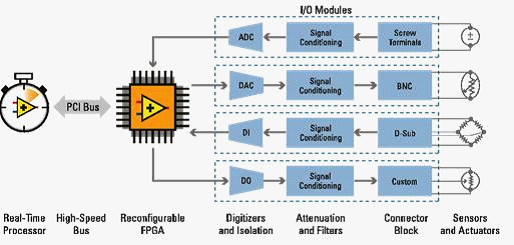 CompactRIO上的FPGA與外界通過C系列I/O模塊連接,C系列I/O模塊由某些隔離模塊、數(shù)模轉(zhuǎn)換器(DAC)或模數(shù)轉(zhuǎn)換器(ADC)組成,還含有專用接頭盒。I/O的功能取決于特定的設計和控制要求。