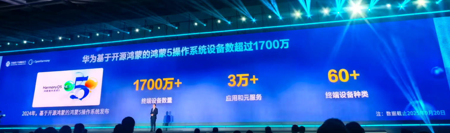 華為常務董事、終端BG董事長余承東致辭,他表示:“五年來,在開放原子開源基金會的孵化運營下,產(chǎn)學研各界齊心聚力,共建開源鴻蒙,開創(chuàng)了我國軟件發(fā)展史上的奇跡?!睋?jù)悉,截至今年9月20日,基于開源鴻蒙的鴻蒙5操作系統(tǒng)的終端數(shù)已突破1700萬,有超過3萬個鴻蒙應用和元服務上架。