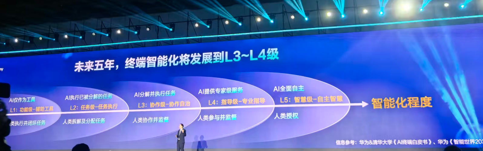 “我們認為智能終端操作系統(tǒng)將變得越來越智能,就像智能汽車那樣,面向用戶操作的功能級、任務級的智能輔助走向面向用戶的用戶意圖的自主智慧。預計未來五年終端智能化將發(fā)展到L3至L4級別,即實現(xiàn)協(xié)作自治與專業(yè)指導?!标惡2ㄕf道。