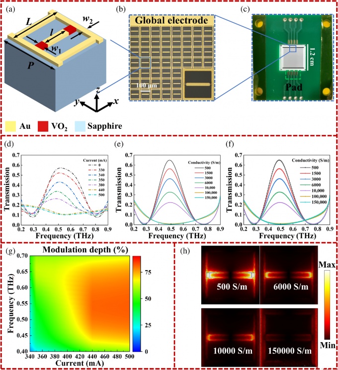 不同于多數(shù)過(guò)渡金屬氧化物,二氧化釩在68℃低溫下即可實(shí)現(xiàn)絕緣體-金屬相變。這種可逆相變使材料能動(dòng)態(tài)調(diào)控太赫茲波的"透射率"。研究團(tuán)隊(duì)設(shè)計(jì)的微梯結(jié)構(gòu)以金線為"扶手",二氧化釩間隙為"梯級(jí)",當(dāng)電流通過(guò)梯級(jí)單元時(shí),電阻熱效應(yīng)引發(fā)的局部溫變可使二氧化釩快速實(shí)現(xiàn)相變,從而實(shí)現(xiàn)高效節(jié)能的太赫茲響應(yīng)調(diào)控。