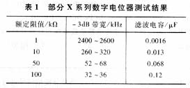 測(cè)試表明:通頻帶寬度主要與其額定阻值的大小和滑動(dòng)端與地之間的濾波電容的容量有關(guān)。額定阻值越小,通頻帶越寬,表1[3]給出了部分X系列數(shù)字電位器-3dB帶寬的測(cè)試結(jié)果(滑動(dòng)端位于中點(diǎn))。
