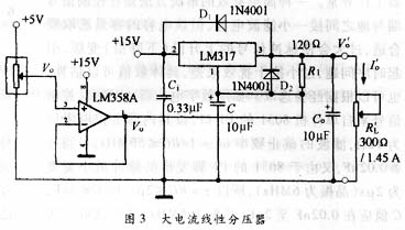 ?為了得到更大的電流,本人用集成三端穩(wěn)壓器設(shè)計(jì)了圖3所示的大電流線性分壓器[4]。LM358為單電源通用集成運(yùn)放,LM317為正電壓可調(diào)集成三端穩(wěn)壓器。LM358接成電壓跟隨器,輸出電壓跟隨分壓器的輸出電壓V0。電壓跟隨器的輸入電阻Ri≥400MΩ(Ri相當(dāng)于分壓器的負(fù)載電阻RL),輸出電阻R0≤1Ω。滿足(RL/R)→∞的條件(R為數(shù)字電位器的額定阻值),故從根本上消除了傳感器負(fù)載特性的非線性。
