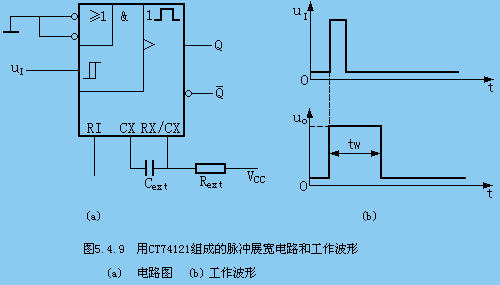 圖5.4.9(a)所示為利用CT74121組成的脈沖展寬電路。