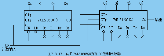 兩片CT74LS160級聯(lián)成100進(jìn)制同步加法計數(shù)器。