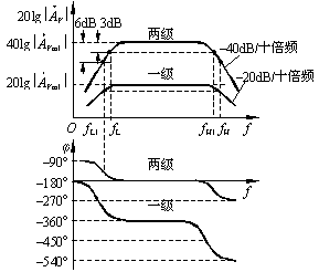 根據(jù)同樣的分析可得,當f =fH1時,增益也下降6dB,且所產(chǎn)生的附加相移為–90°。因此,兩級放大電路和組成它的單級放大電路的波特圖如圖1所示。根據(jù)截止頻率的定義,在幅頻特性中找到使增益下降3dB的頻率就是兩級放大電路的下限頻率fL和上限頻率fH,如圖中所標注。顯然,fL> fL1(fL2),fH< fH1(fH2)。因此,兩級放大電路的通頻帶比組成它的單級放大電路的通頻帶要窄。以上結(jié)論具有普遍意義。