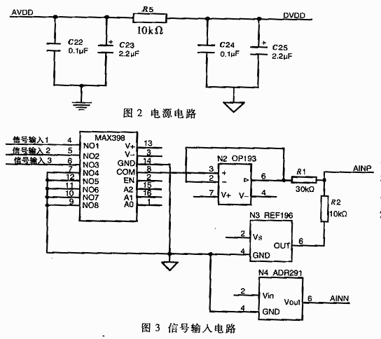 信號輸入電路采用差分輸入,其負(fù)端接2.5V基準(zhǔn)電壓,有效降低了系統(tǒng)噪聲對采樣結(jié)果的影響。