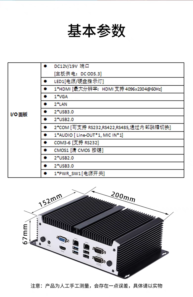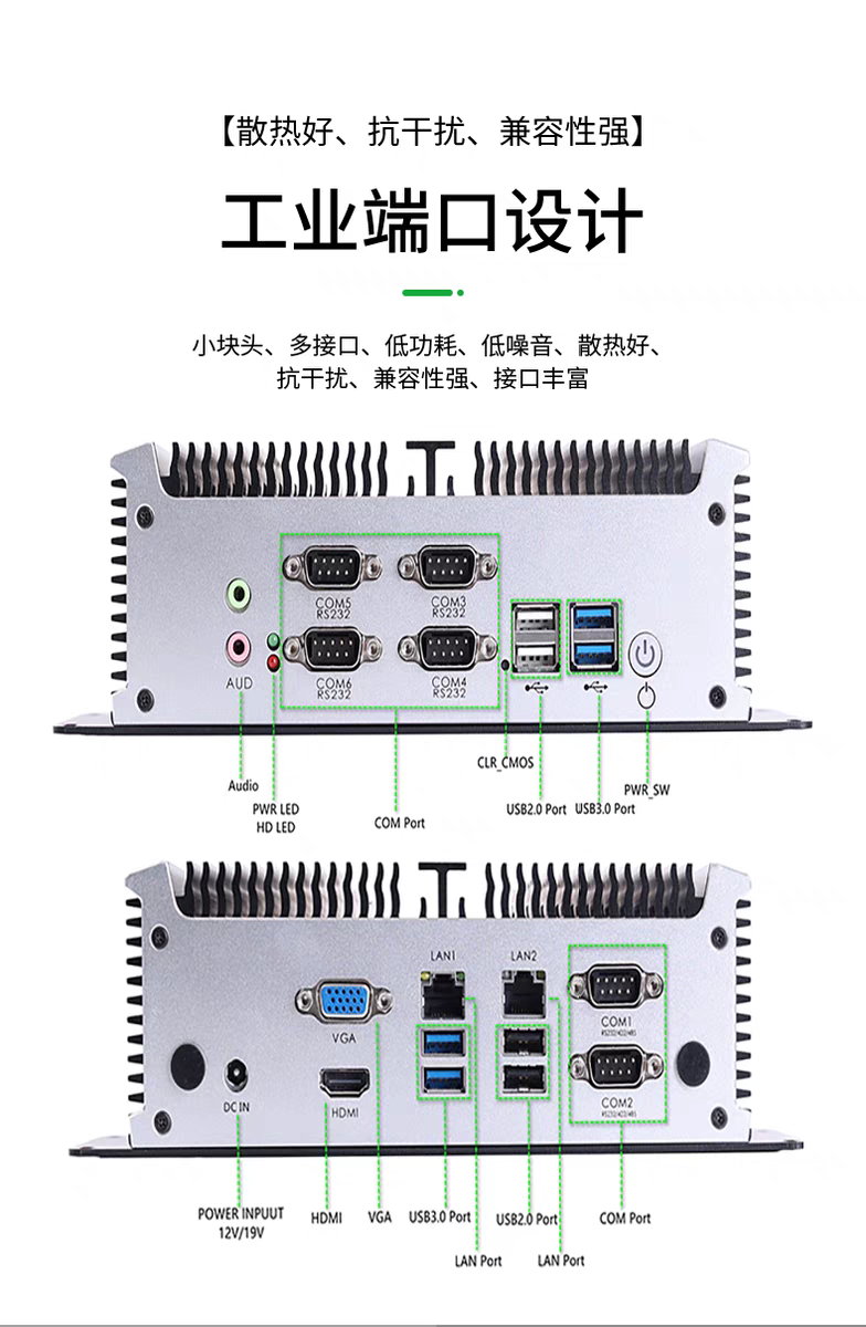 擴展能力與接口配置豐富。設(shè)有 1 個 M.2 E Key 2230 插槽,支持 WIFI+BT 模塊,可實現(xiàn)無線連接;網(wǎng)絡(luò)方面配備 2 個 RTL8111H 網(wǎng)卡,保障網(wǎng)絡(luò)通信穩(wěn)定。接口布局兼顧多樣性與實用性,包含 4 個 USB3.0、4 個 USB2.0,滿足外接設(shè)備需求;6 個 COM 口(其中 2 個支持 RS232/RS422/RS485,可通過內(nèi)部跳帽切換),適配工業(yè)傳感器、控制器等串行設(shè)備;音頻采用 Realtek ACL897 高清音頻驅(qū)動,支持 Line-OUT 與 MIC IN,適用于需要音頻交互的場景。