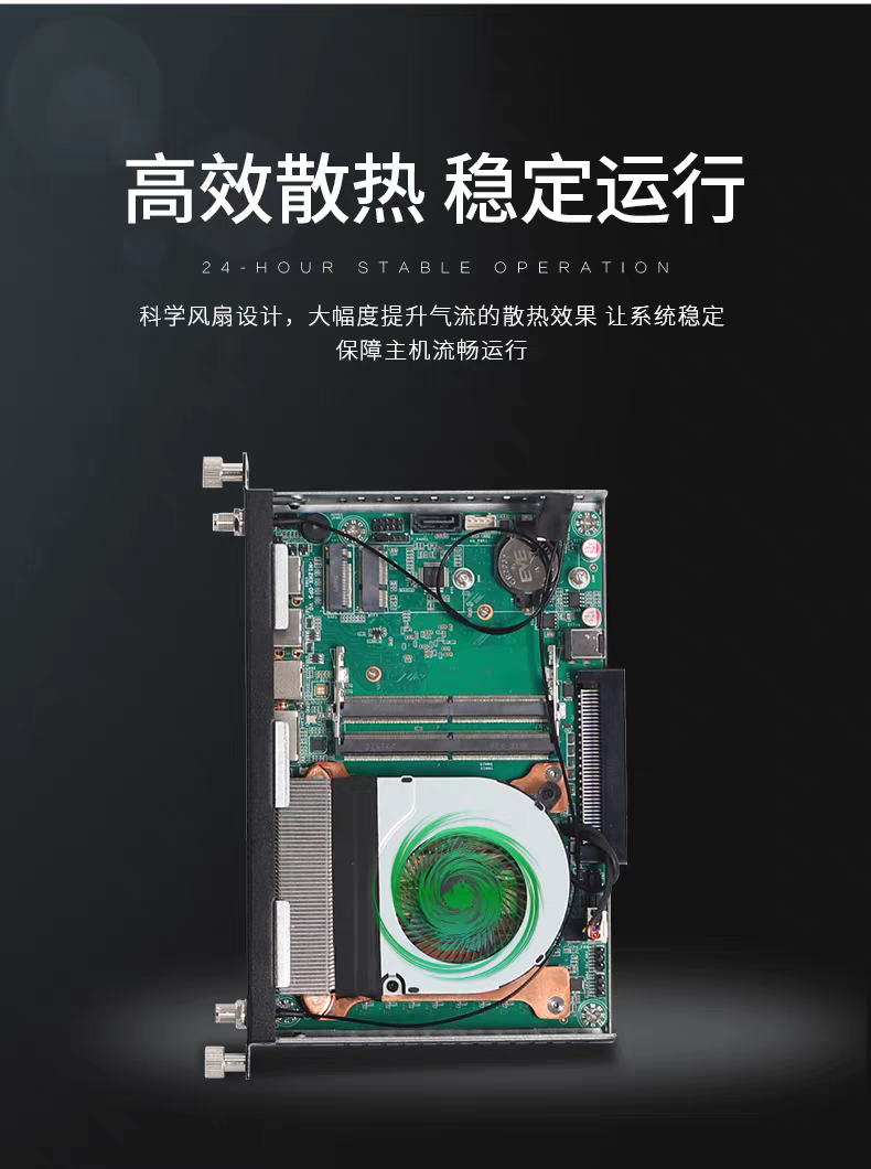為了保障設(shè)備在長時(shí)間運(yùn)行過程中的穩(wěn)定性,這款 OPS 電腦采用了科學(xué)的風(fēng)扇設(shè)計(jì)。通過優(yōu)化氣流路徑,大幅度提升了散熱效果,有效降低設(shè)備運(yùn)行時(shí)的溫度,避免因過熱導(dǎo)致的性能下降或硬件故障,讓系統(tǒng)能夠穩(wěn)定運(yùn)行,保障主機(jī)流暢地完成各項(xiàng)任務(wù)。
