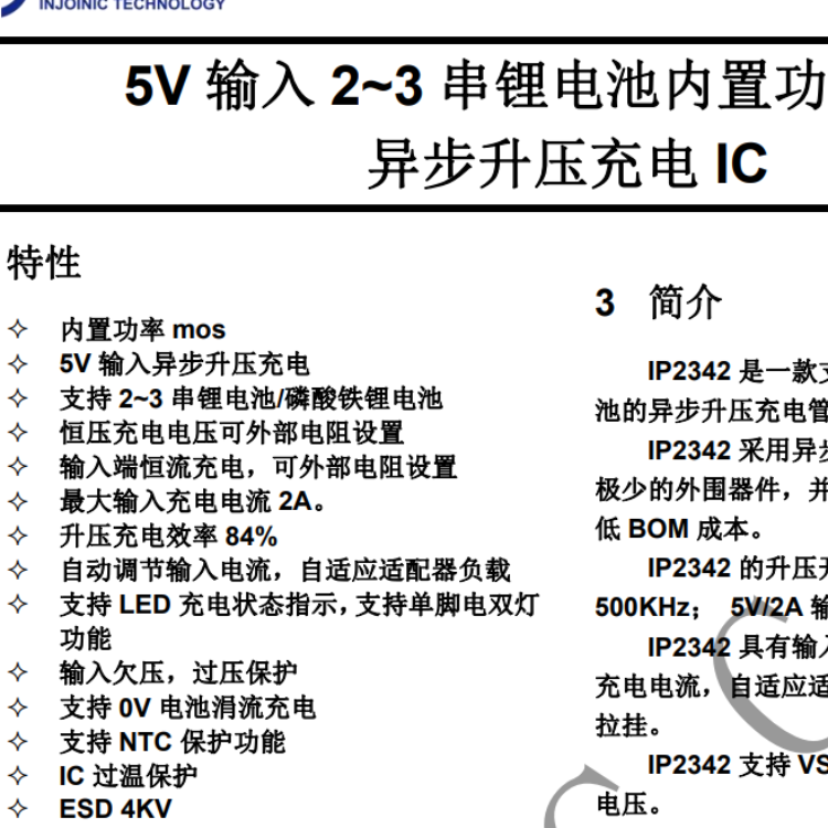 英集芯IP2342是一款適用于掃地機器人、電動工具、智能門鎖等支持5V異步升壓輸入的多串鋰電池充電管理SOC芯片。支持5V輸入異步升壓充電,2~3串鋰電池或磷酸鐵鋰電池。升壓開關充電轉換器工作頻率為500kHz,輸入電壓5V/2A,輸出電壓8V。通過VSET腳外接電阻設置恒壓充電電壓和ISET腳外接電阻設置輸入端恒流充電電流。支持LED充電狀態(tài)指示,可實現(xiàn)單腳電雙燈功能。采用ESOP8封裝,體積小巧,便于集成。內(nèi)置功率MOSFET,減少外圍器件,降低BOM成本