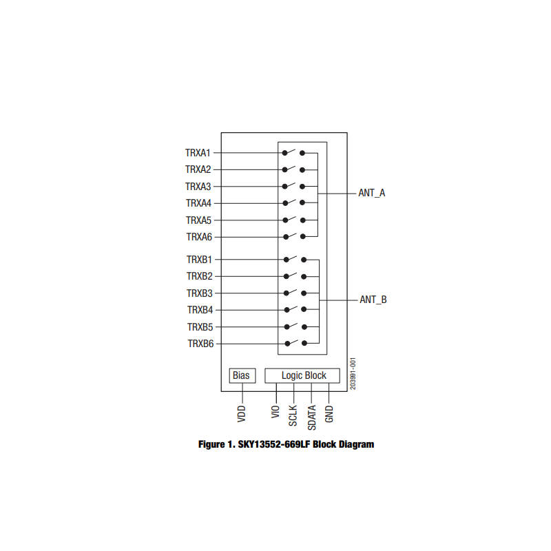 今天我要向大家介紹的是 skyworks 的射頻開關(guān)——SKY13552-669LF。 它的核心結(jié)構(gòu)是“雙單刀六擲”(2xSP6T),意味著它內(nèi)部包含兩個(gè)獨(dú)立的開關(guān),每個(gè)開關(guān)都能將一路信號(天線)切換到六條不同的軌道(射頻路徑)上去。這種設(shè)計(jì)使其能夠同時(shí)管理主天線和分集天線,是實(shí)現(xiàn)接收分集的關(guān)鍵。
