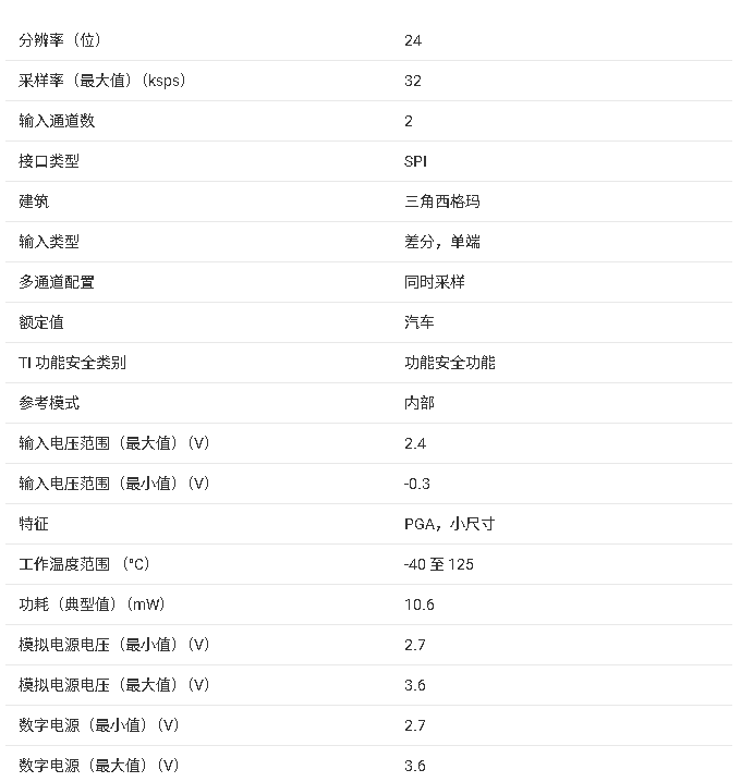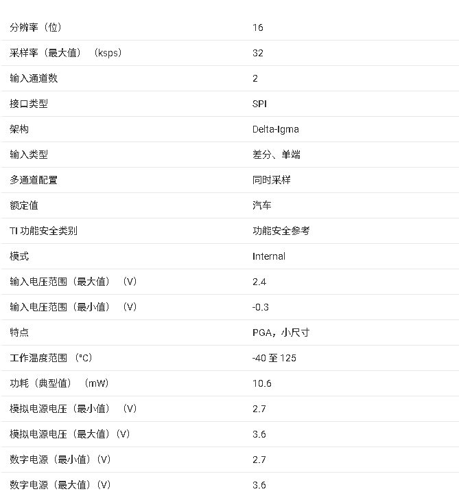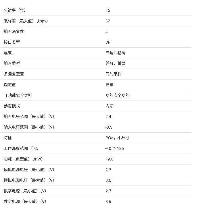 ADS130B04-Q1 是一款四通道、同步采樣、16 位、三角積分 (ΔΣ) 模數(shù)轉(zhuǎn)換器 (ADC),提供寬動態(tài)范圍、低功耗和緩沖模擬輸入,使該器件非常適合汽車電池管理系統(tǒng) (BMS)。ADC 輸入可直接連接到用于雙向電池電流測量的分流電阻器、用于高壓測量的電阻分壓器網(wǎng)絡(luò)或溫度傳感器(例如熱敏電阻...