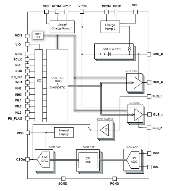 STMicroelectronics L9908車用三相電機(jī)柵極驅(qū)動(dòng)器單元 (GDU) 設(shè)計(jì)用于控制汽車應(yīng)用中的無刷電機(jī)的6個(gè)N溝道FET。三個(gè)半橋驅(qū)動(dòng)器通道(HS/LS耦合)可獨(dú)立配置不同的負(fù)載驅(qū)動(dòng),并可在電機(jī)引腳上承受-14V至+95V偏移。預(yù)驅(qū)動(dòng)器級通過6個(gè)專用并行輸入進(jìn)行控制,支持0%至10...