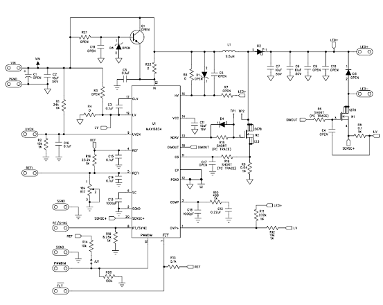 The MAX16834 evaluation (EV kit) is a fully assembled and tested surface-mount PCB designed to evaluate the MAX16834 pulse-width modulated (PWM) HB LED driver controller in a step-up (boost) configuration and optional step-up/step-down (buck-boost) operation.