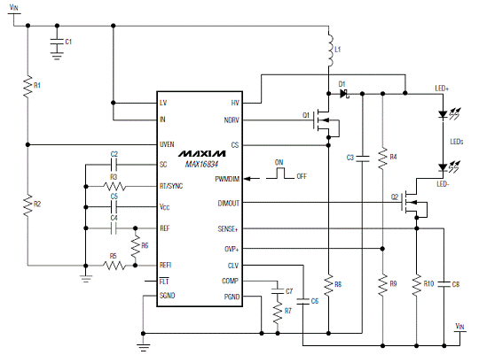 The MAX16834 is a current-mode high-brightness LED (HB LED) driver for boost, boost-buck, SEPIC, and highside buck topologies. In addition to driving an n-channel power MOSFET switch controlled by the switching controller, it also drives an n-channel PWM dimming switch to achieve LED PWM dimming. The MAX16834 integrates all the building blocks necessary to implement a fixed-frequency HB LED driver with wide-range dimming control.