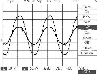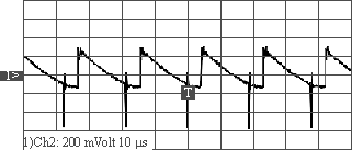 本人用TOP器件所制作的開關(guān)電源輸出噪聲波形,自認(rèn)為比較理想,請各位專家評議評議,是否還有更低的。相應(yīng)的輸出電壓為20V,輸出電流為0.4A。