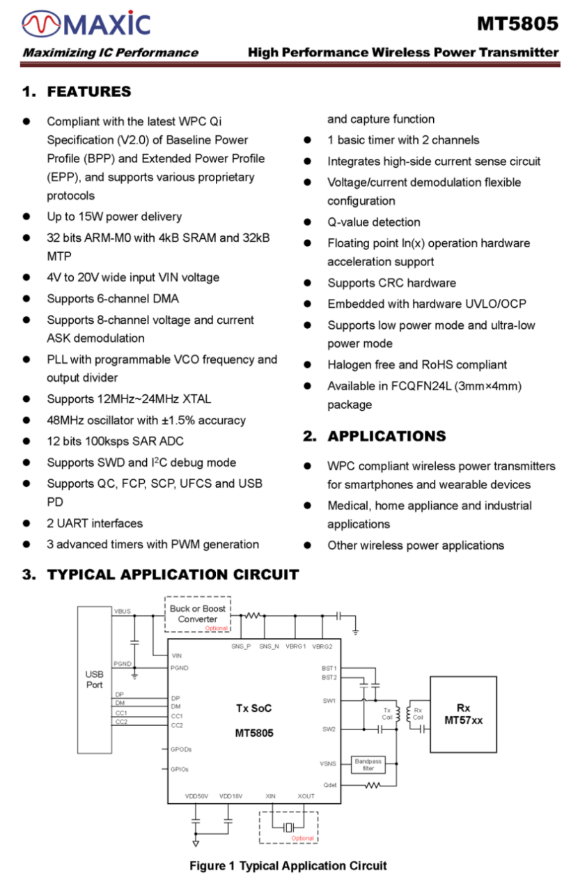 MT5805是單芯片解決方案,內(nèi)部集成32位M0處理器,32KB MTP存儲器和4KB SRAM,符合WPC Qi 2.0規(guī)范,支持無線充電私有協(xié)議,支持功能定制。芯片支持15W輸出功率,4-20V寬輸入電壓,內(nèi)置快充取電功能,支持UFCS融合快充、PD3.0、QC、FCP、SCP協(xié)議,支持單芯片無線充電器應(yīng)用,支持超低功耗工作模式。