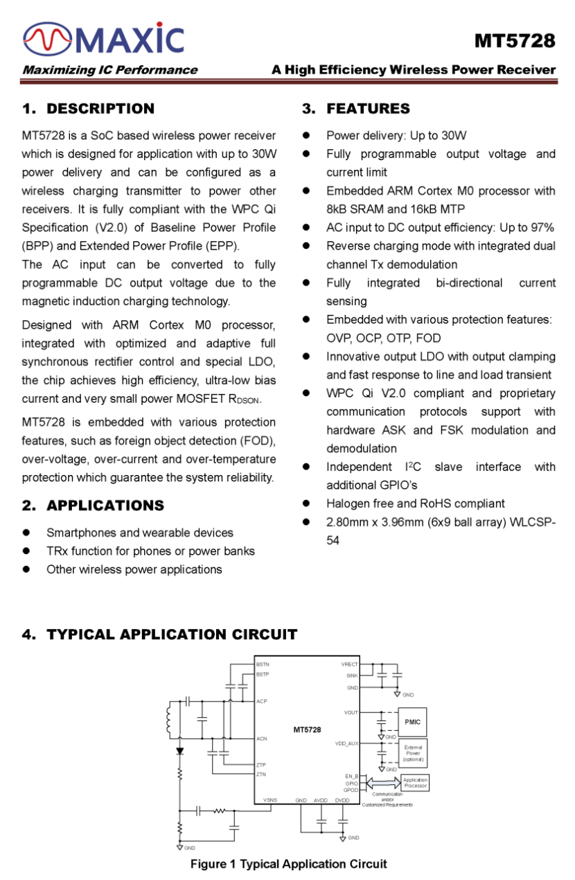 MT5728是一顆符合WPC Qi 2.0規(guī)范的無線充電接收端芯片,支持BPP/EPP,最高達(dá)30W無線充電,同時具備10W反向充電功能,為其他接收端供電。內(nèi)置ARM M0處理器,搭配8KB SRAM和16KB MTP存儲器,支持私有無線充電協(xié)議,芯片內(nèi)部集成同步整流器和LDO。