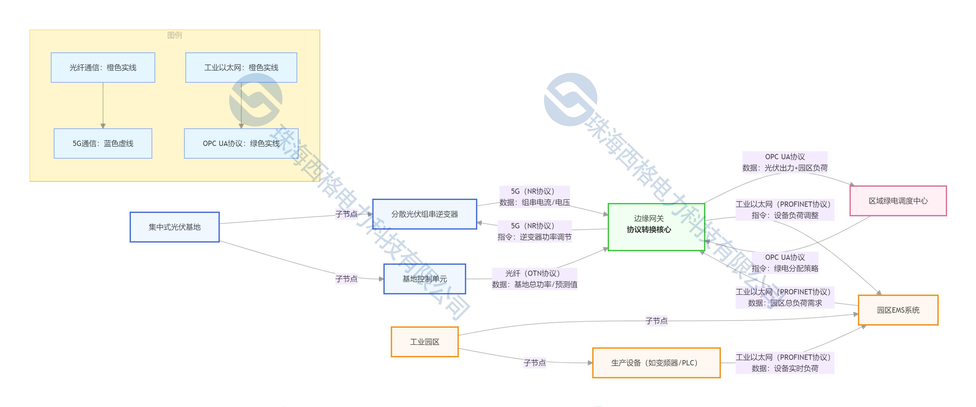 • 協(xié)議邏輯:邊緣網(wǎng)關(guān)是核心樞紐,將光伏側(cè)的 “OTN(光纖)/NR(5G)協(xié)議”、園區(qū)側(cè)的 “PROFINET(工業(yè)以太網(wǎng))協(xié)議”,統(tǒng)一轉(zhuǎn)換為跨場(chǎng)景兼容的 “OPC UA 協(xié)議”,實(shí)現(xiàn)數(shù)據(jù)互通與指令下發(fā)。