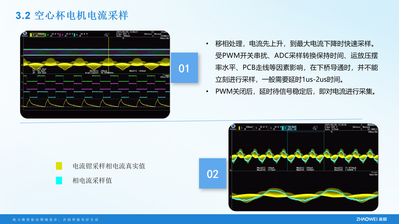 因此,兆威集團(tuán)提出了改進(jìn)措施,一是移相處理,電流先上升,到最大電流下降時快速采樣。二是PWM關(guān)閉后,延時待信號穩(wěn)定后,即對電流進(jìn)行采集。如下圖,經(jīng)過處理之后,現(xiàn)在的采樣模型基本上是能夠代表實際的電流波。