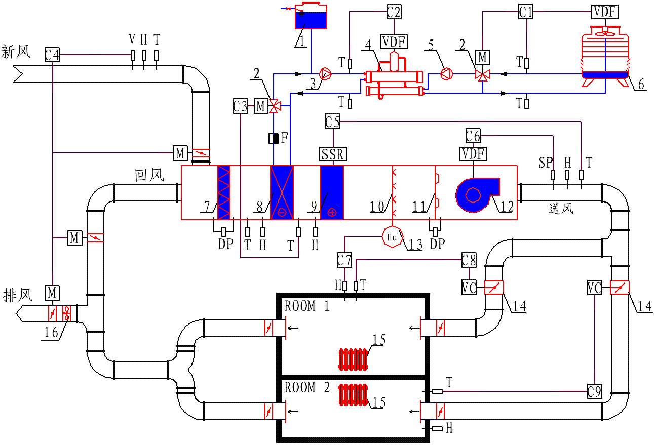 ● 風(fēng)系統(tǒng)包括:組合式空調(diào)箱、送風(fēng)管道、回風(fēng)管道、排風(fēng)管道、VAVBOX以及閥門和其他控制元件??照{(diào)箱包括新回風(fēng)混合段、過濾器、表冷器、電加熱器、送風(fēng)風(fēng)機(jī)、蒸汽加濕器等。風(fēng)機(jī)變頻控制。新回風(fēng)管上分別裝有電動(dòng)調(diào)節(jié)閥,可調(diào)節(jié)新回風(fēng)比例,表冷器前后分別裝有溫濕度測(cè)點(diǎn),空調(diào)箱內(nèi)還裝有噴嘴,用于空氣流量的測(cè)量。