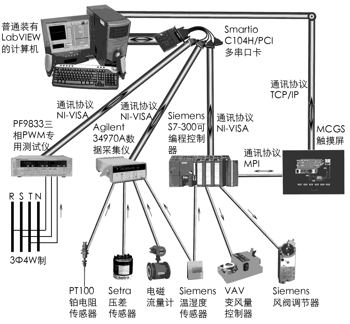 控制元件進(jìn)行準(zhǔn)確測(cè)量及時(shí)控制的數(shù)據(jù)采集控制系統(tǒng)。使用NI公司的LabVIEW Developer Suite,把HVAC系統(tǒng)中各種不同設(shè)備統(tǒng)一起來,進(jìn)行集中采集控制。建立一套基于PC的HVAC數(shù)據(jù)采集控制系統(tǒng)。