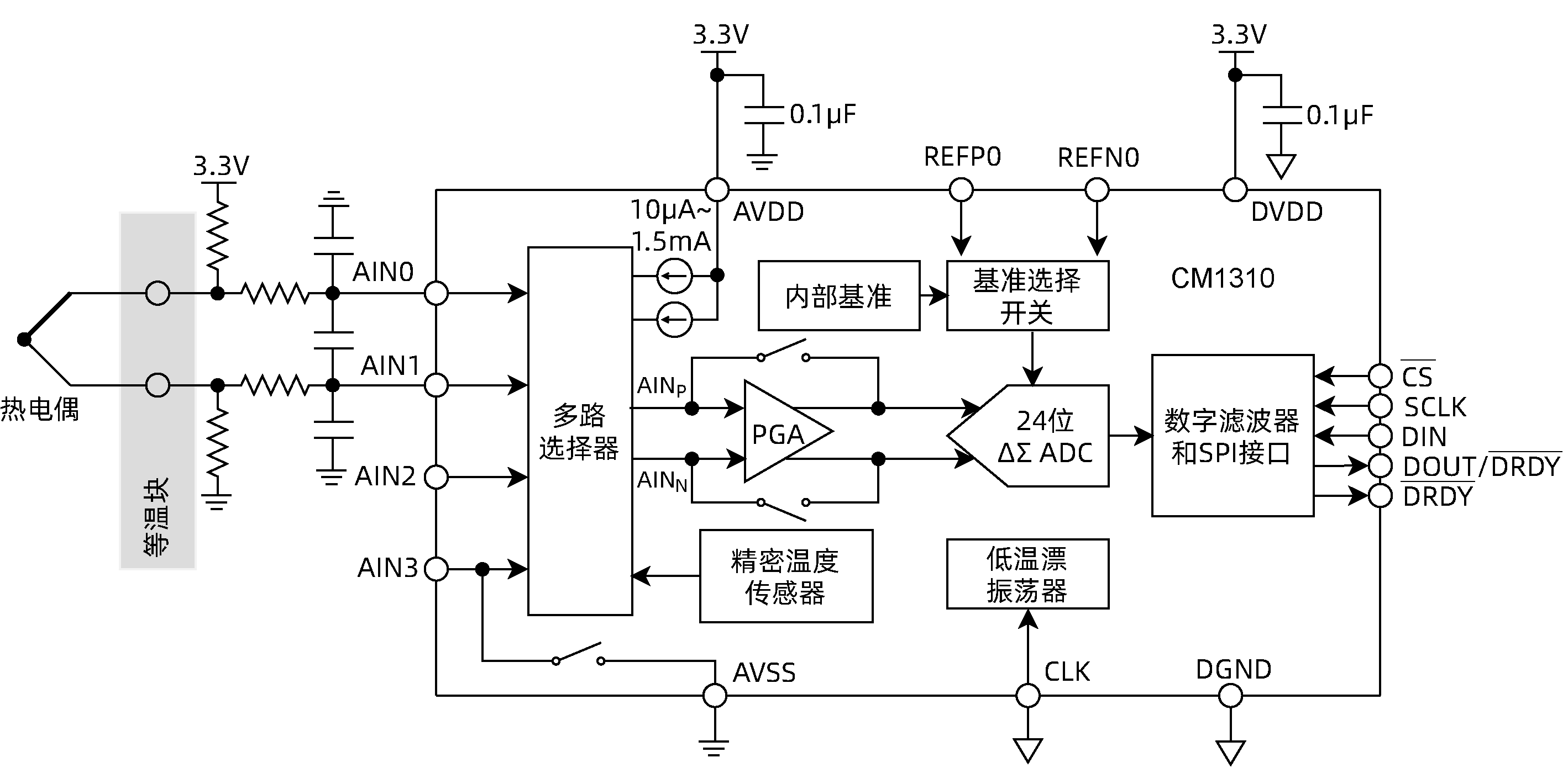 CM1310是一款精密、低功耗、兼容SPI接口、24位ΔΣ ADC,其內(nèi)部集成了一個低噪聲可編程增益放大器(PGA)、兩個可編程輸出電流源(IDAC)、一個電壓基準、一個振蕩器、一個低側開關和一個精密溫度傳感器。這些特性使得CM1310適用于測量微弱信號,例如電阻式溫度檢測器(RTD)、熱電偶、熱敏電阻和橋式傳感器。