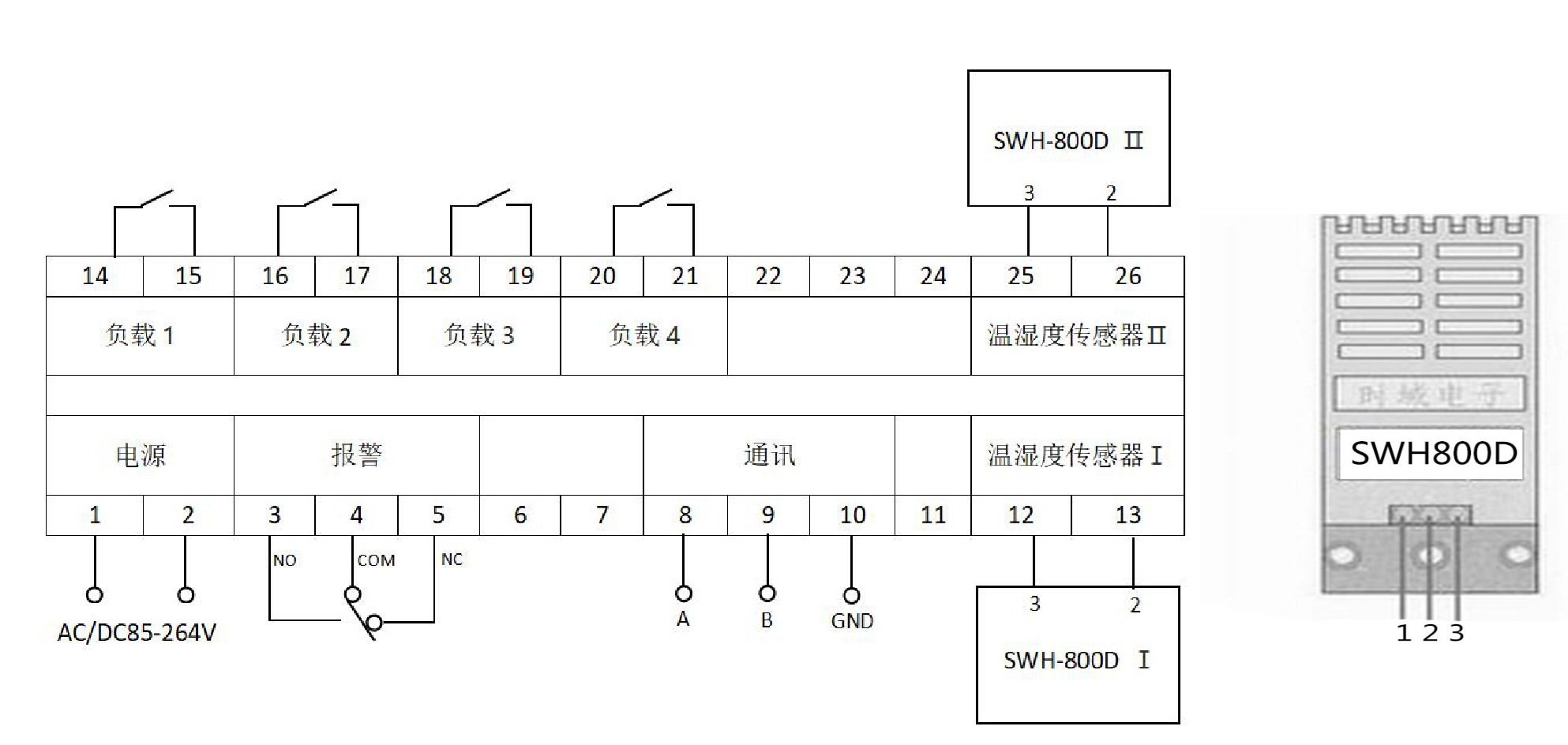 有三路溫度控制,三路濕度控制??赏瑫r(shí)對(duì)三個(gè)獨(dú)立被測(cè)環(huán)境的溫度、濕度進(jìn)行實(shí)時(shí)精密監(jiān)控。使環(huán)境溫度、濕度指標(biāo)符合工作要求,并可以有效地防止凝露產(chǎn)生。用數(shù)字顯示溫度和濕度的設(shè)定值或測(cè)量值;用戶(hù)通過(guò)按鈕自行設(shè)定溫度控制值和濕度控制值;加濕、除濕工作模式可設(shè)置;有加熱升溫、除濕和風(fēng)扇降溫雙控功能;并能對(duì)加熱(降溫)、除濕裝置的斷路故障自動(dòng)報(bào)警;同時(shí)具有傳感器斷路報(bào)警并自動(dòng)切斷負(fù)載的功能,有效防止由于傳感器斷路造成負(fù)載失控長(zhǎng)期運(yùn)行; □技術(shù)參數(shù): ◆供電電壓: AC / DC 85~265V ◆測(cè)量控制范圍:溫度 -50℃~150℃ 顯示精度 ±0.1℃ (<100℃ )檢測(cè)精度:±0.5℃ 濕度0~100%RH 顯示精度 ±0.1%RH 檢測(cè)精度:±3%RH (10%RH~99%RH) ◆參數(shù)設(shè)置: 控制值:全量程0~100% 回差:溫度1~30℃ 濕度1~40%RH 傳感器誤差修正:溫度-50℃~150℃ 濕度0~100%RH ◆顯示方式:三位LED數(shù)碼管顯示,1位小數(shù),三路循環(huán)顯示 ◆加熱控制:?jiǎn)?dòng):溫度≤設(shè)定溫度(下限); 濕度≥設(shè)定濕度 ...... 停止:溫度≥設(shè)定溫度(下限)+溫度回差; 濕度≤設(shè)定濕度-濕度回差 ◆風(fēng)扇控制:?jiǎn)?dòng):溫度≥設(shè)定溫度(上限); 停止:溫度≤設(shè)定溫度(上限)-溫度回差 ◆功率消耗: ≤ 5W ◆負(fù)載繼電器輸出容量:AC220V / 7A(阻性負(fù)載時(shí))六路 ◆報(bào)警繼電器觸頭容量:AC220V / 7A(阻性負(fù)載時(shí))一路 ◆外形尺寸: 控制器 96ⅹ96ⅹ125mm 傳感器 75×80×28.5mm □安裝方式: 嵌入式安裝:在安裝面板上開(kāi)91+0.5ⅹ91+0.5mm孔,用安裝支架將控制器固定在面板上。 ![]() |